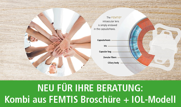 Mit der Kombination aus Broschüre und FEMTIS-IOL-Modell können Sie Ihren Patienten demonstrieren, wie die FEMTIS-Linse innerhalb der Kapsulorhexis fixiert wird.